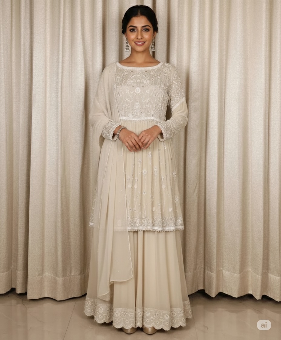 Grace personified this off-white suit set is a serene and sophisticated ensemble, perfect for those who believe in understated elegance. Crafted with fine embroidery on the yoke and sleeves, the kurta flows beautifully over a matching sharara bottom. Paired with a delicate sheer dupatta, this ensemble whispers luxury while keeping things effortlessly minimal. Ideal for day events, nikkah ceremonies, or pre-wedding rituals.
