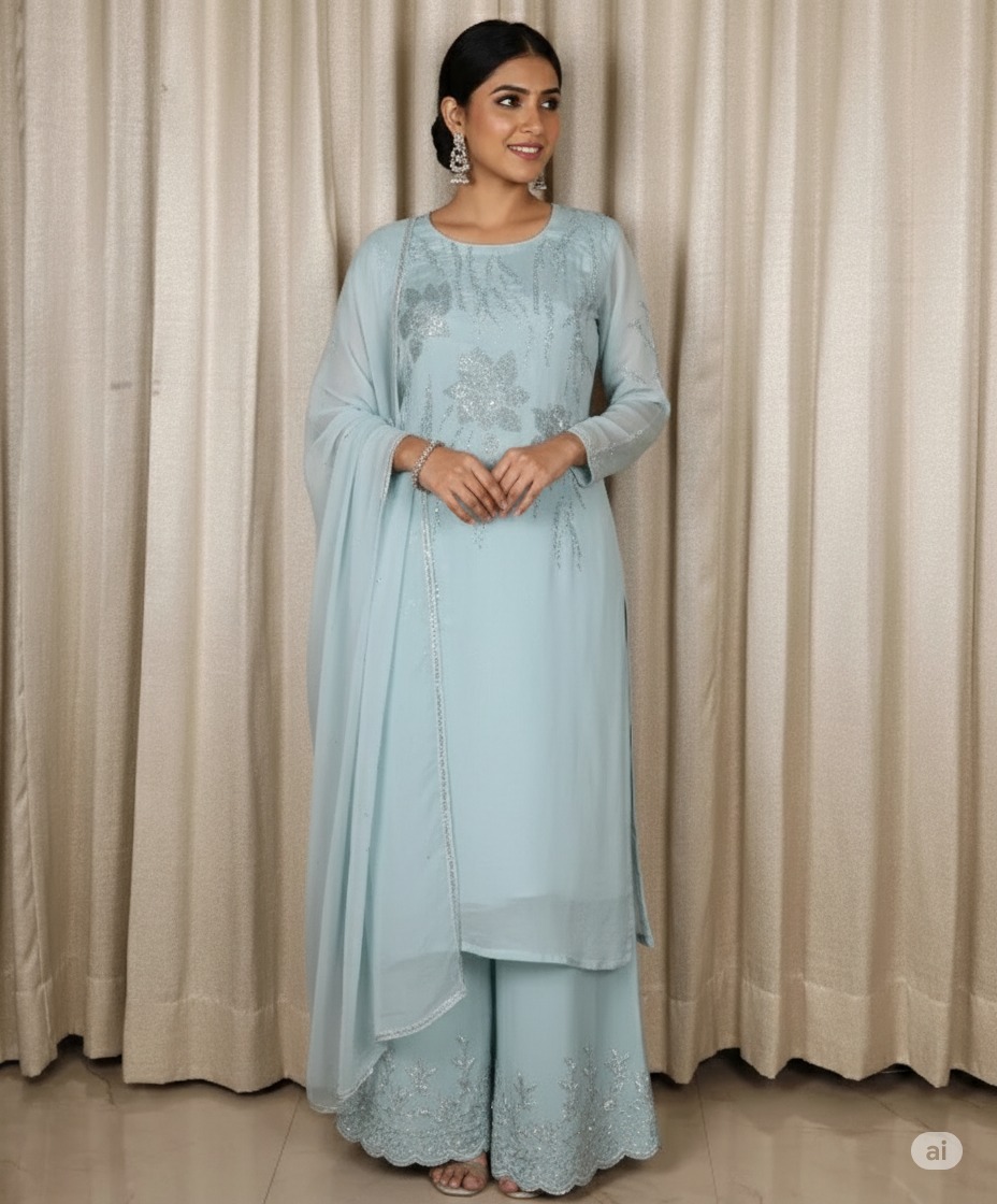 Soft, sophisticated, and timeless – this powder blue suit set is the embodiment of understated luxury. Delicate floral embroidery adds just the right touch of detail to the calming hue, making it ideal for intimate celebrations, festive evenings, or daytime events. The flowy silhouette and lightweight fabric ensure effortless grace and comfort.