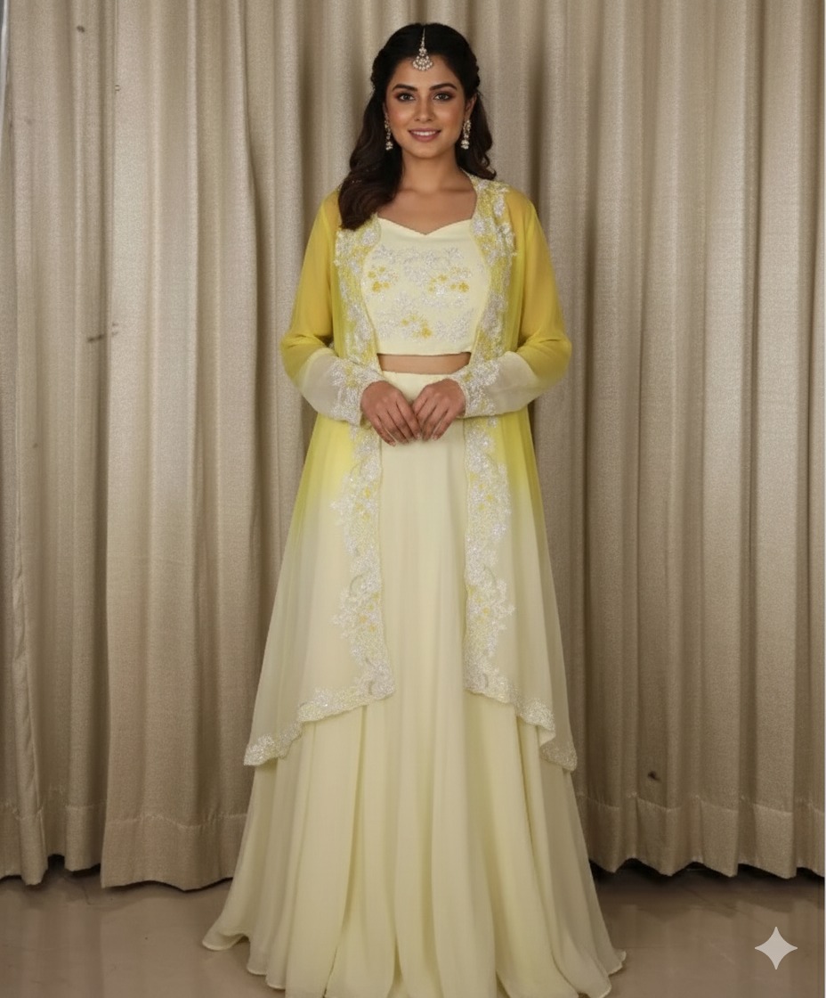 Illuminate any event in this enchanting pastel yellow fusion ensemble a harmonious blend of ethnic detailing and modern styling. The set features an intricately embroidered blouse, a flowing skirt with soft fall, and a sheer cape/overlay with elegant motifs. This piece exudes romance and sophistication, perfect for receptions, daytime parties, and fusion weddings.
