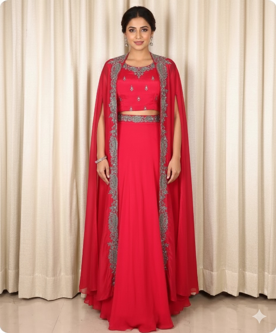 Turn heads in this elegant and dramatic red fusion outfit, combining classic Indian design elements with modern styling. A richly detailed bodice meets a flowing base, while an embellished cape/overlay adds regal flair. Whether for weddings, receptions, or formal occasions, this outfit offers the boldness of red with the sophistication of fusion fashion.